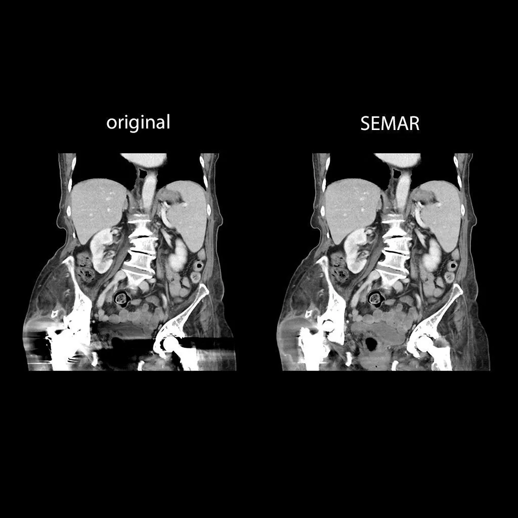 • SEMAR - убирает артефакты, вызванные наличием металлических имплантатов, и повышает распознавание анатомических тканей вокруг них