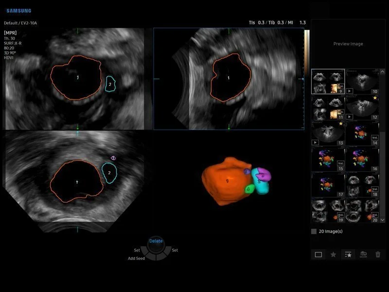 • Модуль автоматического распознавания центральной линии и толщины эндометрия для визуализации коронарного среза матки в режиме объемного сканирования Uterine Contour;